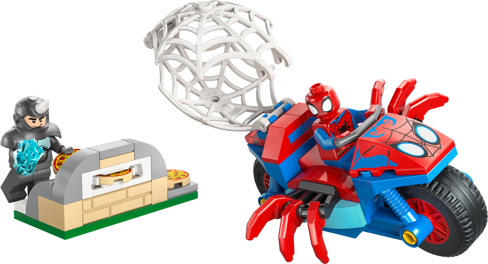 Děti Spideymu pomůžou získat zpět ukradený modrý drahokam, vyhýbat se létajícím pizzám, které Rhino vystřeluje z pece na pizzu, a lapit Rhina do obří pavučiny, kterou lze připevnit na motorku. Tato stavebnice byla navržena pro začínající stavitele a je plná detailů, které děti inspirují k hodinám nápaditého hraní. Poslouží jako skvělý dárek k narozeninám nebo jakékoli jiné příležitosti pro fanoušky seriálu Spidey a jeho úžasní přátelé. Součástí balení je barevný obrázkový návod na stavění, velké začátečnické kostky a samostatné sáčky – v každém je jeden sestavitelný model –, díky kterým se děti rychle a snadno pustí do stavění. S aplikací LEGO® Builder děti můžou přibližovat a otáčet modely ve 3D a sledovat postup pomocí srozumitelného digitálního návodu. Stavebnice obsahuje 61 dílků.