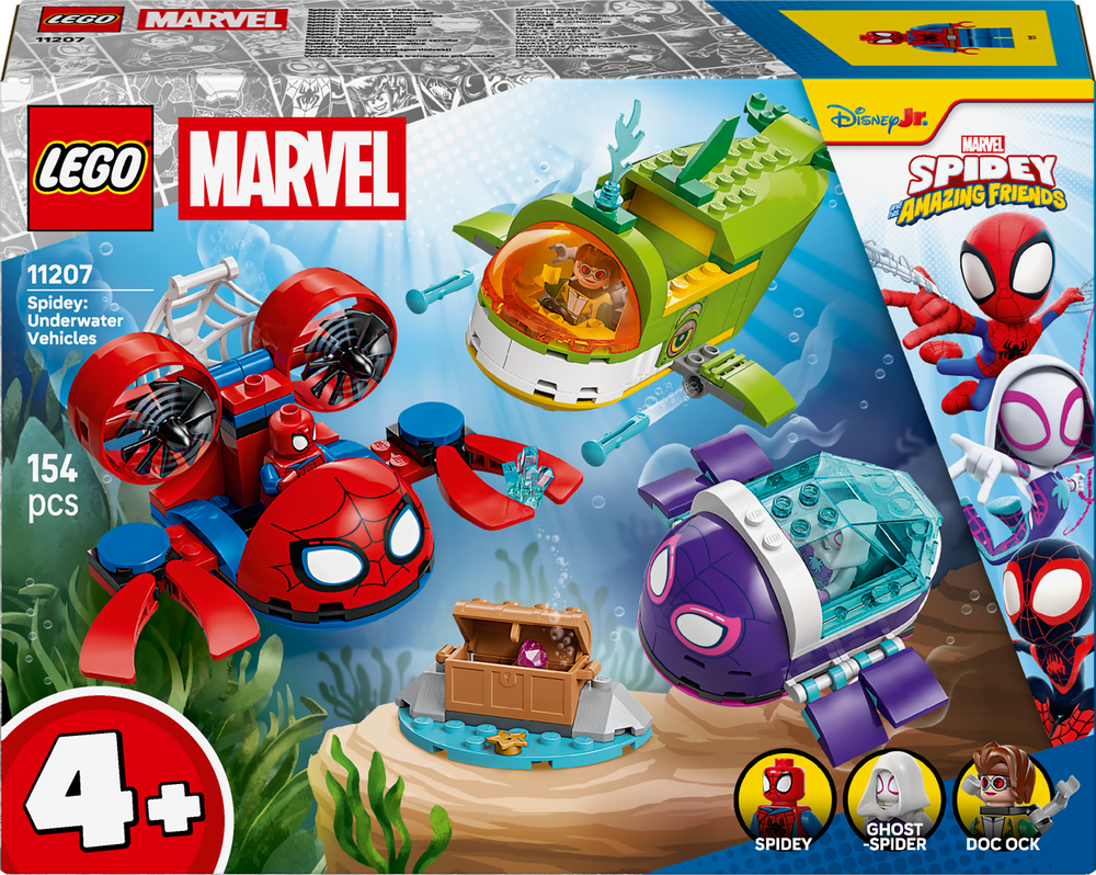 Nechybí trojice podmořských vozidel: Spideyho krabí ponorka s velkou pavučinovou pastí, želví ponorka Ghost-Spider s otevíracím průhledným krunýřem a velrybí ponorka Doktorky Ock s vystřelovači na ploutvích a úložným prostorem pro truhlu s pokladem. Stavebnice Spidey: Podmořská vozidla poslouží jako skvělý dárek k narozeninám pro fanoušky seriálu Spidey a jeho úžasní přátelé. Stavebnice byla navržena pro malé stavitele a součástí balení je barevný obrázkový návod na stavění, velké začátečnické kostky a samostatné sáčky – v každém je jeden sestavitelný model –, díky kterým bude stavění snadnější, rychlejší a zábavnější. S aplikací LEGO Builder děti můžou přibližovat a otáčet modely ve 3D a sledovat postup pomocí srozumitelného digitálního návodu. Stavebnice obsahuje 154 dílků.