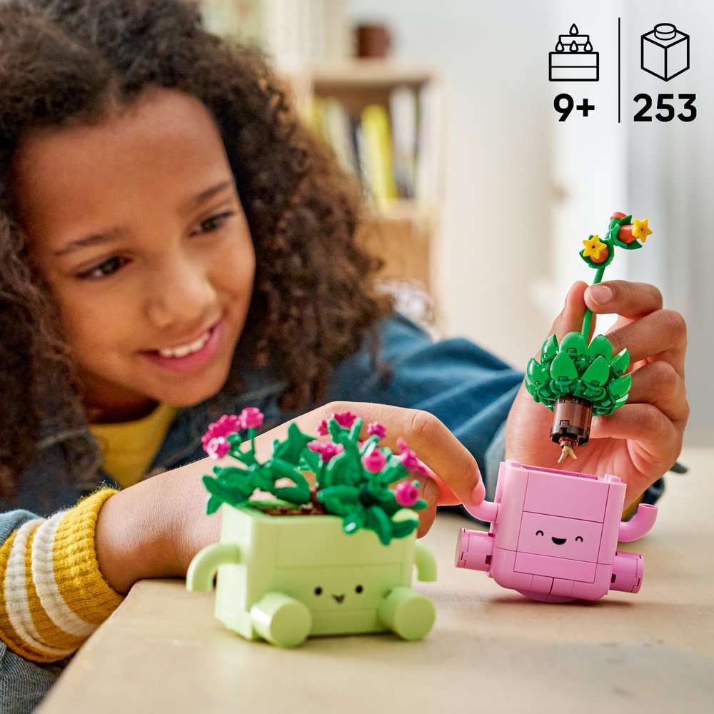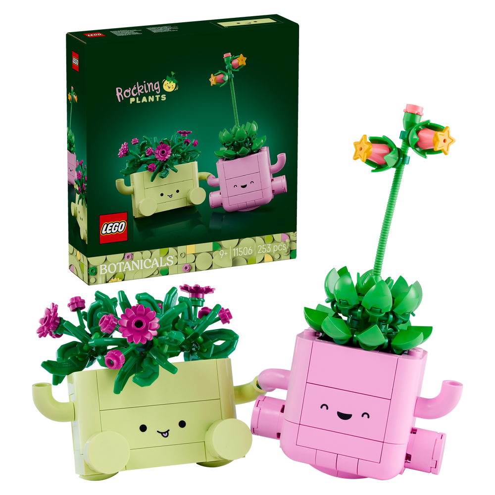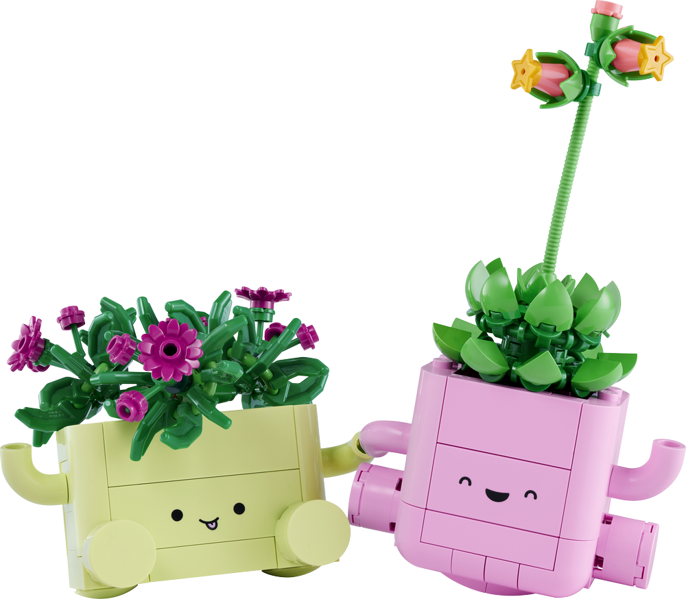 Šiřte radost a vytvořte 2 veselé modely rostlin LEGO v pastelových květináčích – delospermu Lumi s fialovými pupeny a dužnatku Ellie s dlouhým stonkem a korálově zbarvenými poupaty. Květináče se rozmile usmívají a mají zaoblené dno, takže se při lehkém pohnutí kývají – světle zelený květináč se kýve dopředu a dozadu a světle růžový květináč zase ze strany na stranu. Pro ještě větší porci zábavy jsou obě rostliny LEGO kompatibilní s oběma květináči a dokonce je lze kombinovat s květináči ze stavebnice Veselé rostlinky (10349), která se prodává samostatně. To povzbuzuje dětskou kreativitu a inspiruje k vytvoření vlastního rostlinného aranžmá, které si hrdě vystaví v pokojíčku.