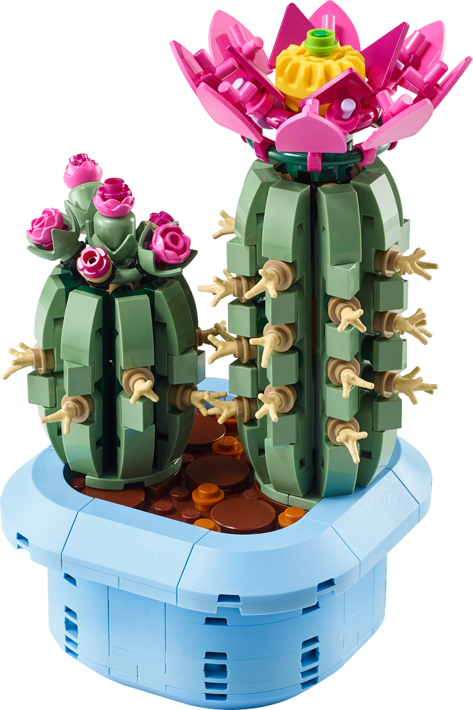 Dětská kreativita bude při stavění dvojice kaktusů přímo kvést. Větší kaktus LEGO má plně rozkvetlý růžový květ se žlutým středem a menší kaktus LEGO má růžová poupata v různých fázích růstu. Kaktusy mají autentický odstín zelené barvy a jsou zasazeny do pastelově modrého květináče, aby si je děti mohly po sestavení snadno vystavit jako dekoraci v pokojíčku nebo domova.