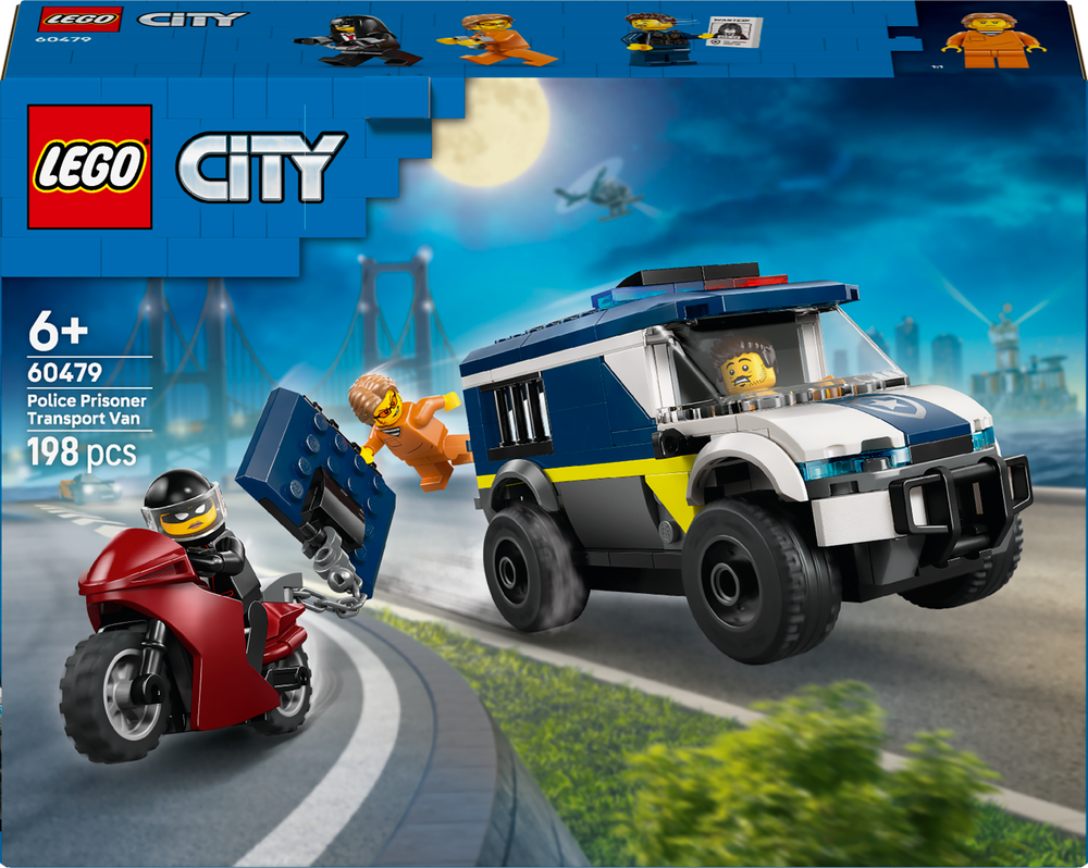 Připravte se na napínavá dobrodružství se stavebnicí LEGO® City Policejní dodávka pro převoz vězňů (60479) pro děti od 6 let. Model policejního vozu má propracovanou kabinu řidiče a vězeňskou celu s prostorem pro 2 zločince. Děti můžou pomocí hračky v podobě motocyklu s řetězem a hákem vytrhnout dveře cely. Stačí přidat minifigurku policisty a 2 minifigurky zločinců a můžete si přehrát na napínavou scénu s útěkem z vězení.