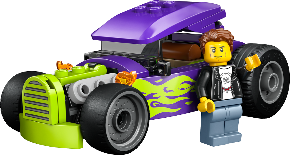 Malí milovníci závodních aut od 5 let můžou vyrazit se na superrychlé závody s autíčkem LEGO® City Hot rod (60485). Tato stavebnice auta nadchne malé stavitele díky propracovaným závodním prvkům, včetně obrovských zadních pneumatik, kokpitu řidiče se zvedací střechou a parádnímu fialovému barevnému provedení s neonově zelenými plameny. Stačí přidat minifigurku řidiče a můžete odstartovat superrychlou jízdu!