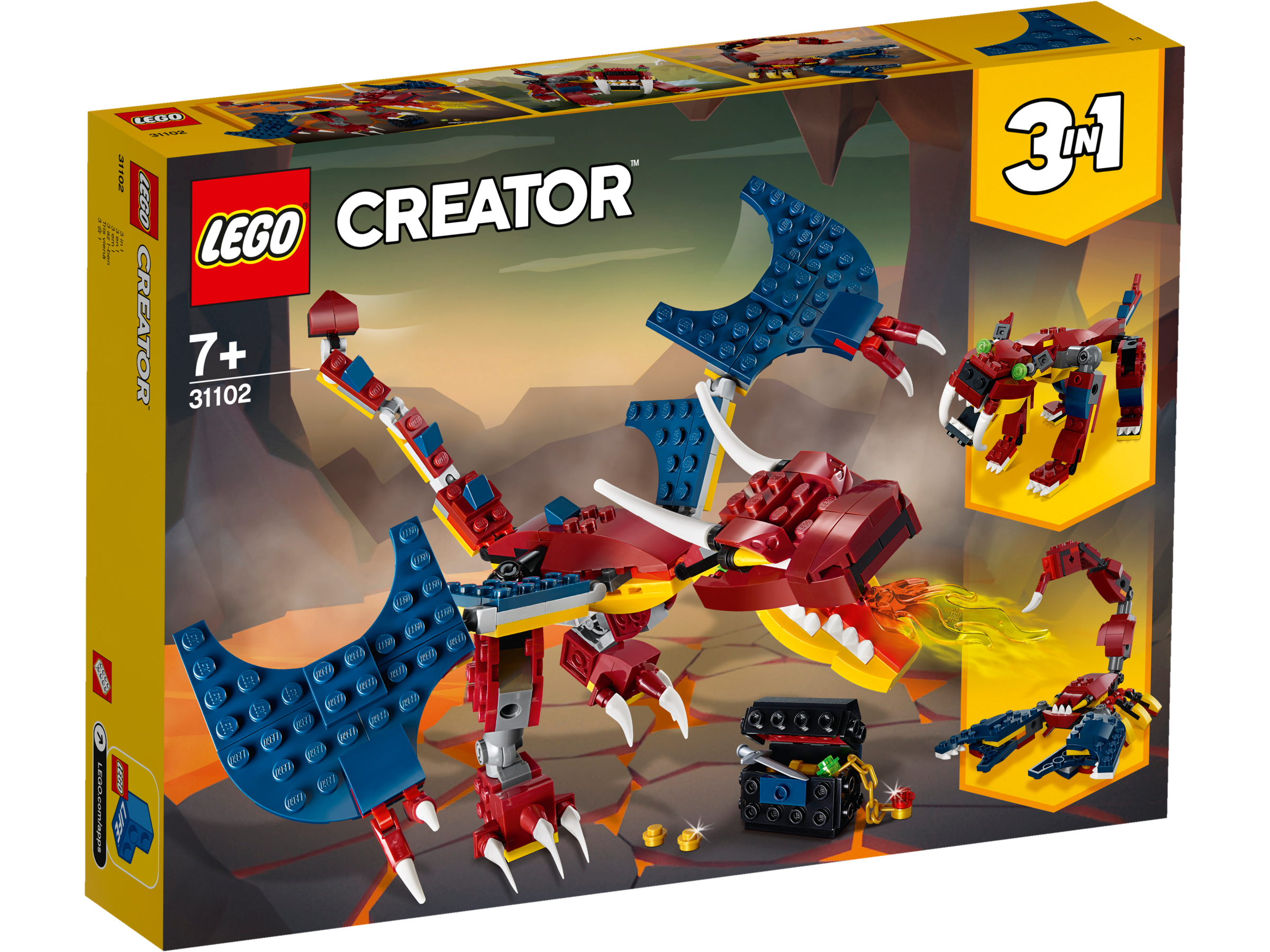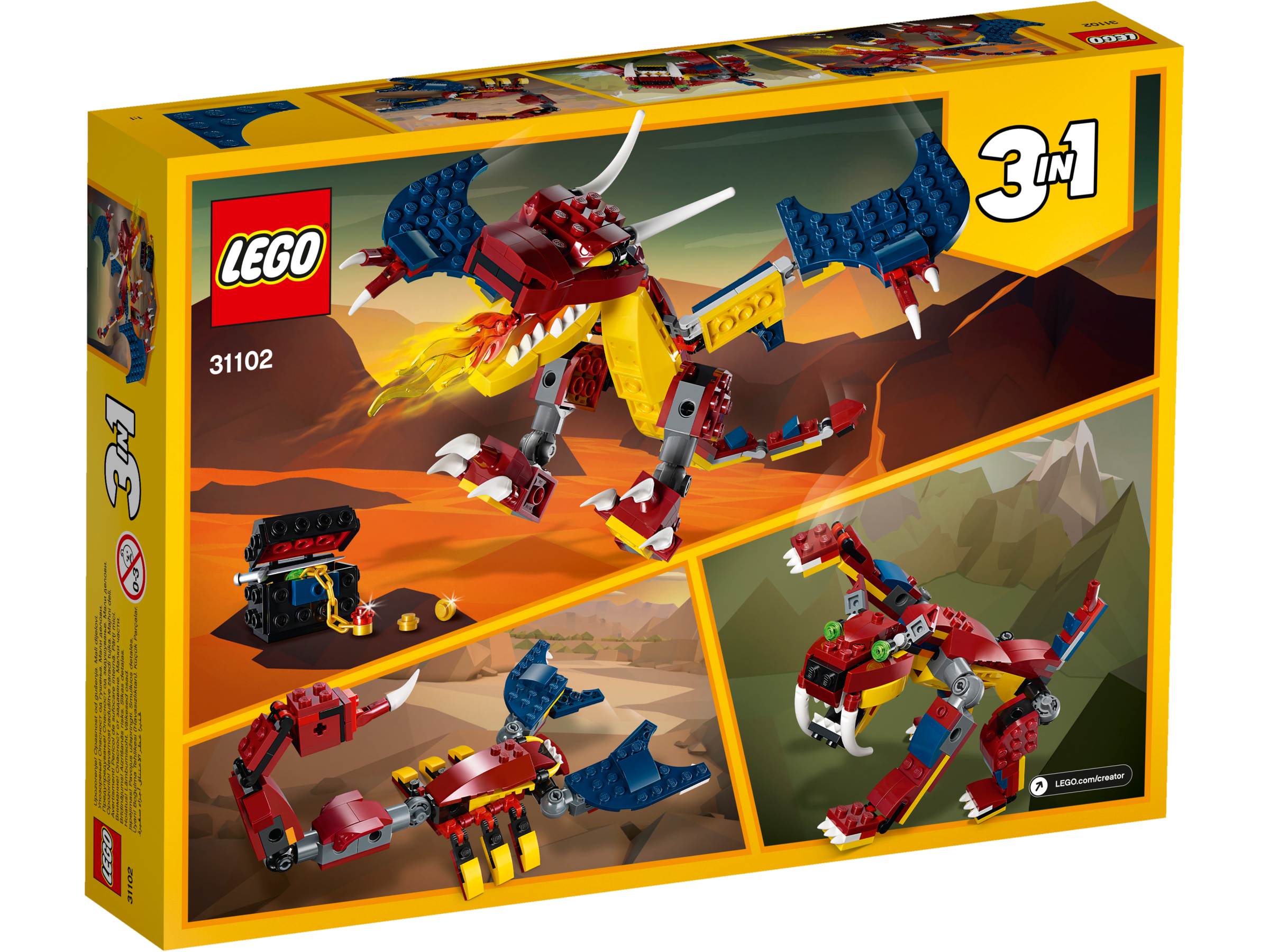 - Hned 3 stavitelské možnosti v 1 sadě. Tato stavebnice (31102) od Creator 3 v 1 rozvíjí stavitelské dovednosti dětí a nabízí modely ohnivého draka, šavlozubého tygra a škorpióna. S modely si lze hrát samostatně nebo je kombinovat s dalšími LEGO® hračkami.