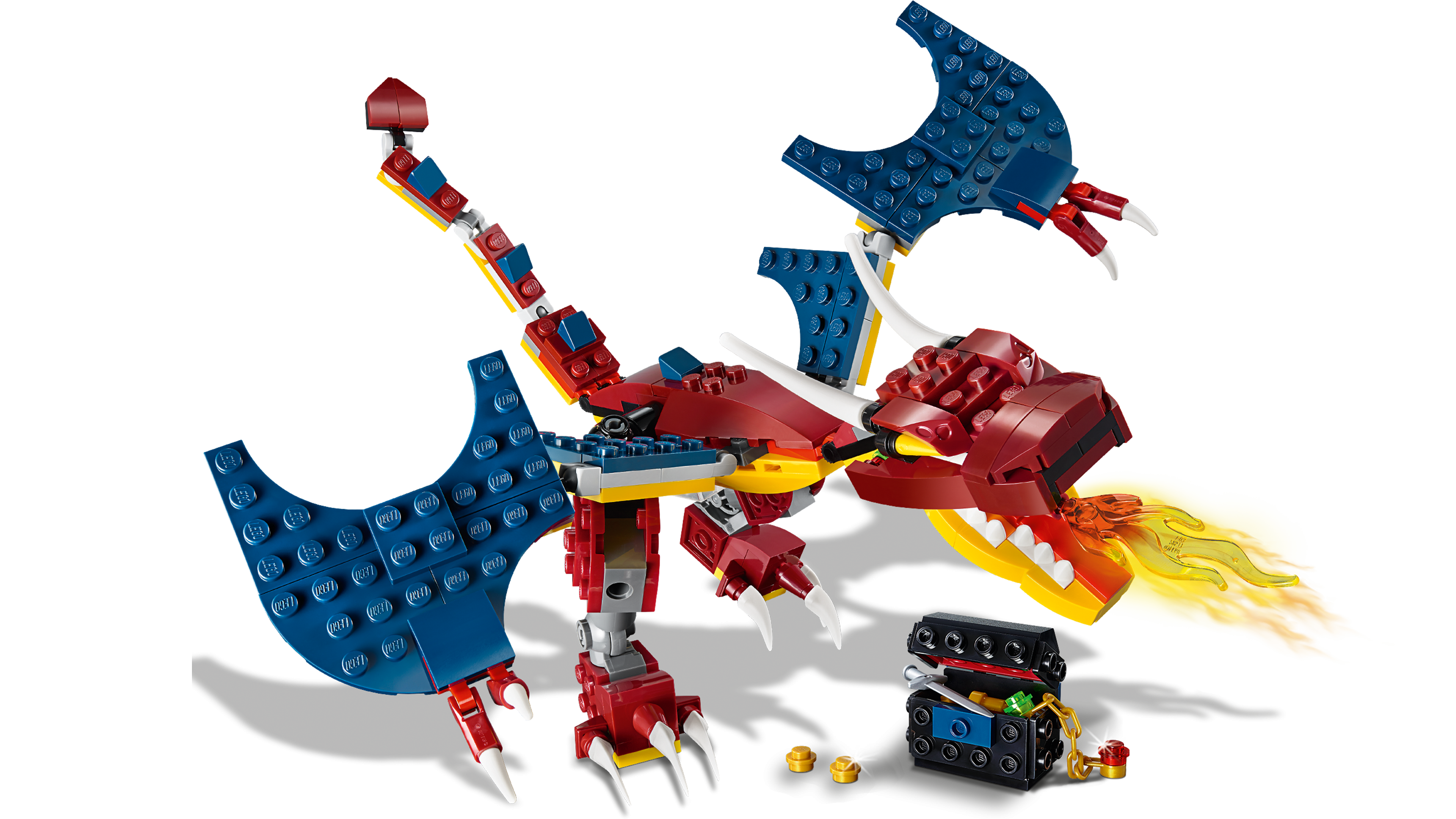 Co je nejlepší na tom, když máte ohnivého draka? Přece poklad, který střeží! Uložte poklad do truhlice, ukryjte ji pod křídla draka a ukažte hledačům pokladů, kdo je tady pánem. Pak se proleťte po okolí a nashromážděte další lesklé a drahocenné předměty. Až budete mít všechny ve svém vlastnictví, přestavějte draka na nelítostného šavlozubého tygra, nebezpečného škorpióna nebo něco jiného! Dokážete zkrotit všechna tři zvířata z této sady?