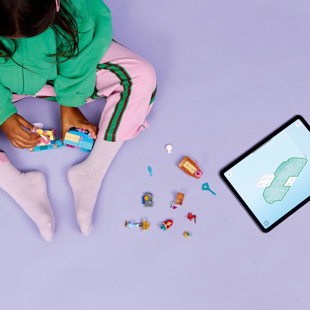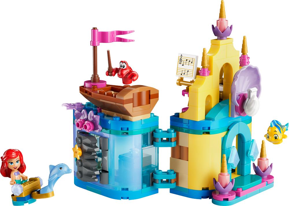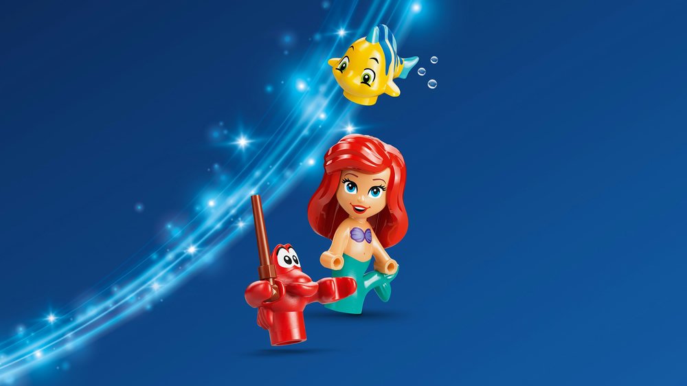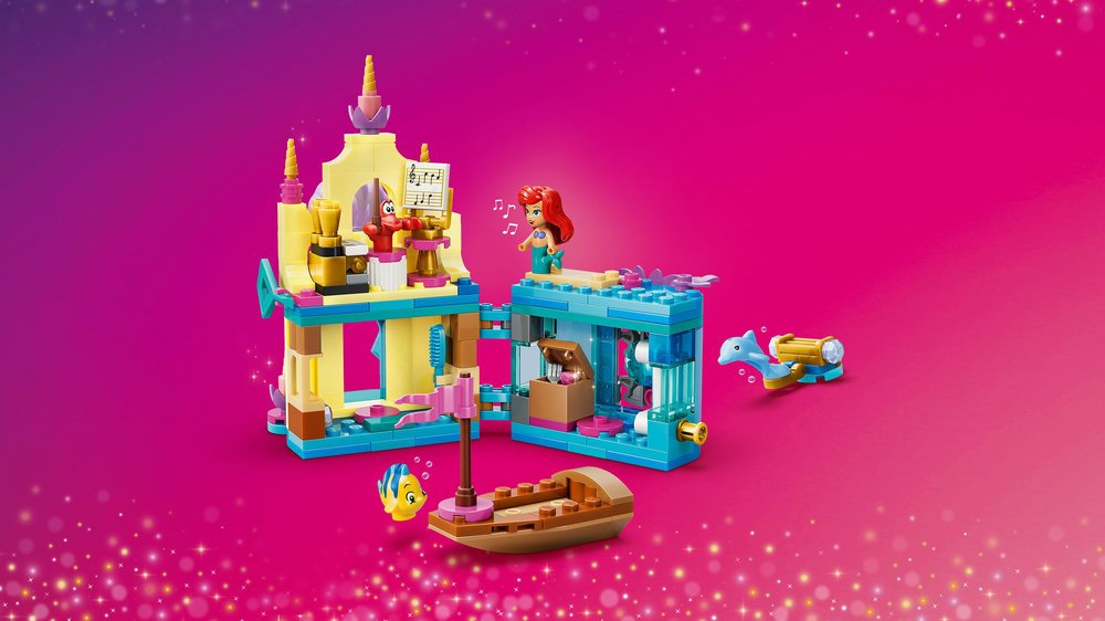 - STAVEBNICE NA MOTIVY FILMU DISNEY MALÁ MOŘSKÁ VÍLA – Stavebnice Ariel a její kouzelný miniaturní palác (43285) obsahuje postavy Ariel, Šupinku a Sebastiana LEGO® ǀ Disney, loďku a uzamykatelný miniaturní palác a jeskyni