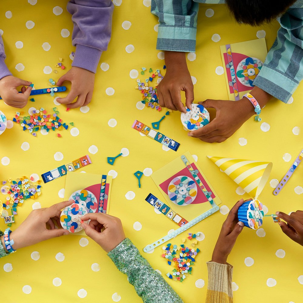 Řada DOTS dětem zprostředkuje radost z hraček LEGO a umožní jim experimentovat při vytváření a zdobení různých modelů. Kouzlo spočívá v dětské fantazii. Tato stavebnice je vhodná jako kreativní skupinová aktivita, jejíž účastníci si navíc mohou z party nebo setkání odnést něco na památku.- Kreativní zdobení čeká – Překvapte milovníky ručních prací od 6 let zábavnou stavebnicí Úžasná party sada (41806) od LEGO® DOTS, která obsahuje 6 dortíků, 6 náramků, 6 vlaječek a spoustu dalších prvků