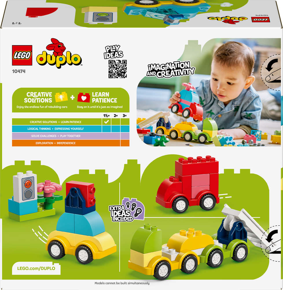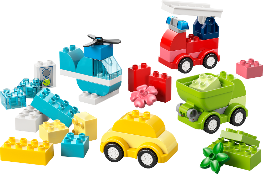 Nejprve si sestaví hlavní modely vrtulníku LEGO DUPLO s otáčející se vrtulí, náklaďáku se sklápěcí korbou, hasičského auta s výklopným žebříkem a malého rodinného auta. Při rozebírání těchto hraček z kostek následně procvičí jemnou motoriku a koordinaci rukou a očí, a nakonec přidají špetku kreativity a další kostky k vytvoření zcela nových modelů. Batolata mohou popustit uzdu fantazii a kombinovat kostky LEGO DUPLO dle libosti a vytvářet nové a překvapivé modely – od policejních aut přes dlouhé nákladní vozy až po dvoupatrové autobusy.