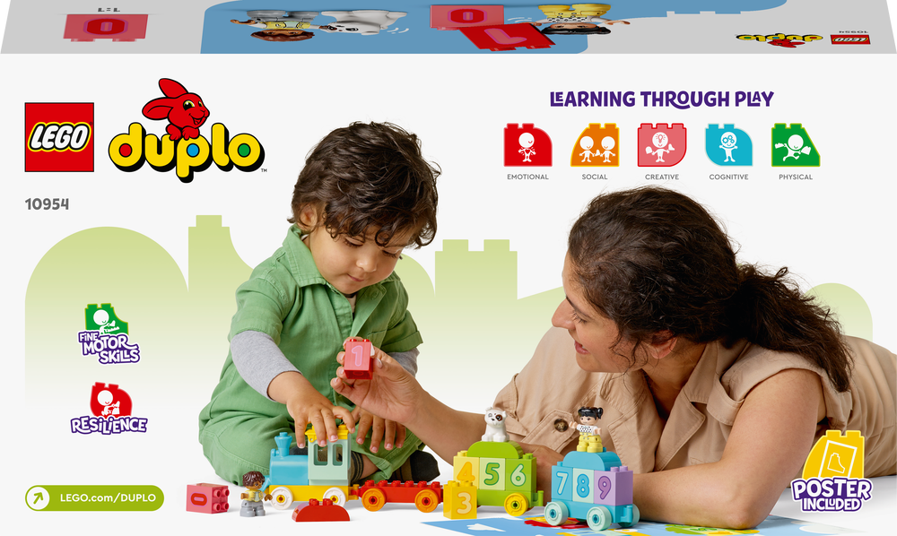 Hračky LEGO DUPLO dětem nabízí neomezenou zábavu, možnost sebevyjádření a učení hrou. Díky stavebnicím DUPLO mohou být rodiče u významných vývojových milníků svých dětí, které prožijí, zatímco si budou vychutnávat dlouhé hodiny hraní a stavění.- Darujte dětem vstupenku do světa čísel a počítání ve formě sady Vláček s čísly – Učíme se počítat (10954) od LEGO® DUPLO®. Tato nová verze kultovního vláčku je ještě barevnější než všichni jeho předchůdci.