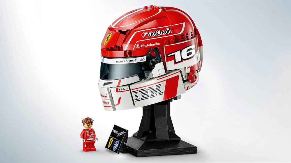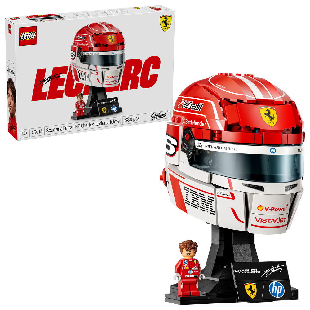 Milovníci motorových vozidel se mohou ponořit do závodní akce při skládání detailní repliky helmy F1® z kostek LEGO. Model je proveden ve slavné barvě Ferrari Rosso Monaco (závodní červená) a zdobí jej tištěné grafické detaily, jako závodní číslo Charlese Leclerca a další detaily s osobní hodnotou. Součástí balení je také minifigurka Charlese a destička označená jeho podpisem. Jakmile fanoušci překročí cílovou čáru, mohou si helmu LEGO hrdě vystavit jako sportovní dekoraci. Model rovněž představuje skvělý dárek k narozeninám pro teenagery a fanoušky F1®.