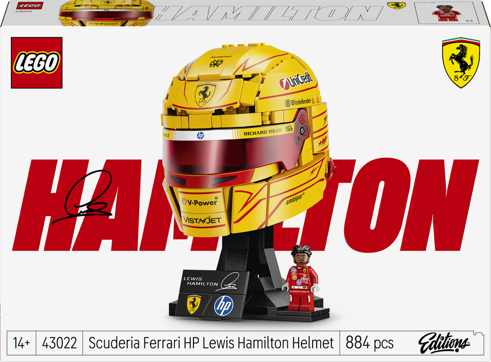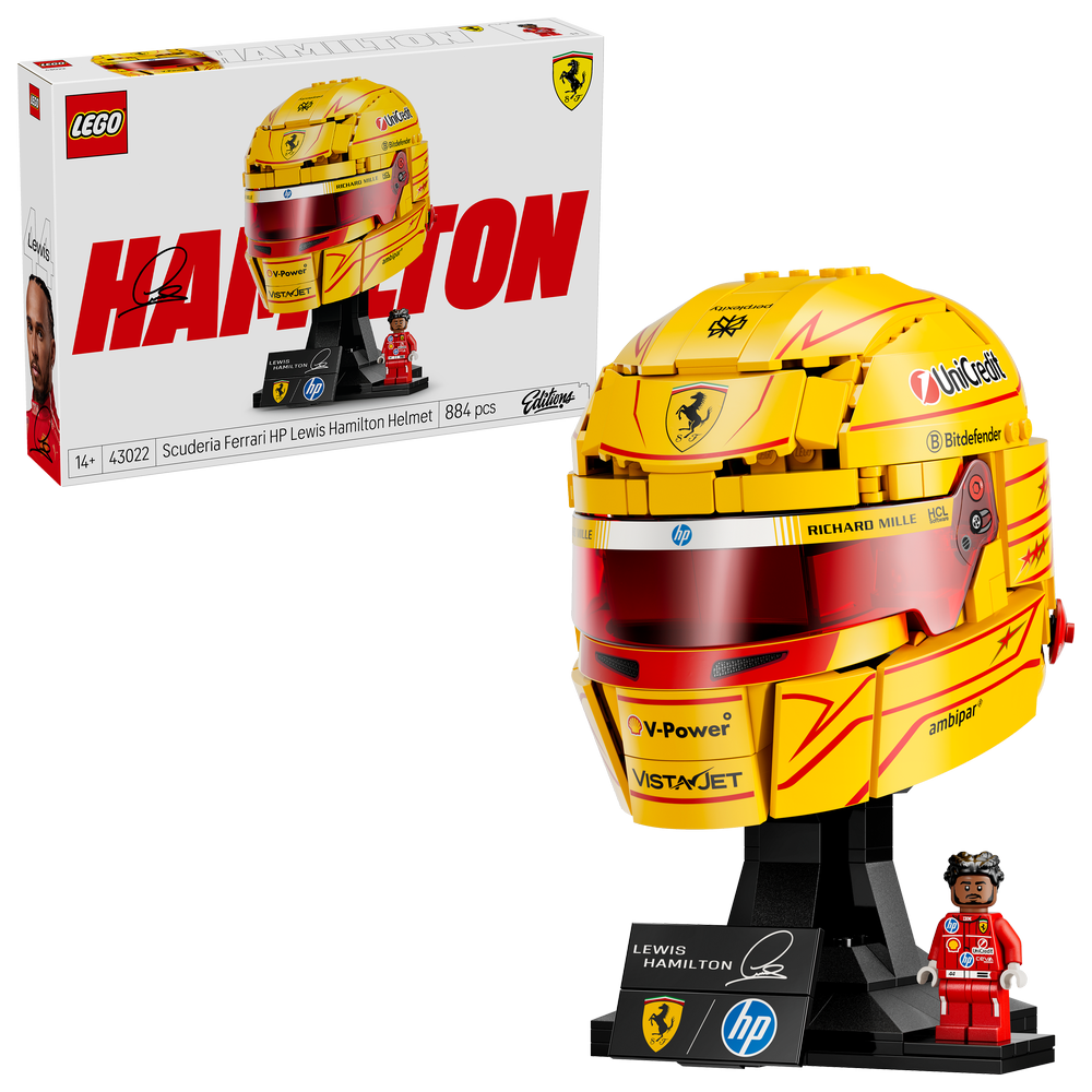 Milovníci automobilů si při skládání výstavního modelu v ikonické Modena žluté barvě značky Ferrari užijí spoustu zábavy. Velmi podrobný model obsahuje tištěné detaily, včetně Lewisova jedinečného startovního čísla a cedulky s podpisem. Součástí je minifigurka Lewise Hamiltona ve své červené závodní kombinéze Scuderia Ferrari HP. Po dokončení se stane úchvatnou sportovní dekorací, kterou si fanoušci vystaví samostatně nebo společně s dalšími sběratelskými helmami LEGO® F1®, prodávanými samostatně. Nechte si ji pro sebe nebo potěšte teenagery a milovníky aut, a připravte jim úžasný narozeninový nebo vánoční dárek.