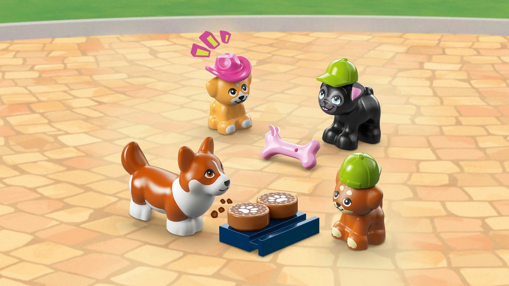 Tato stavebnice plná příběhů obsahuje 2 minipanenky, 4 hračky v podobě pejsků a spoustu doplňků pro domácí mazlíčky, se kterými si děti užijí hodiny zábavy. Součástí je také jídelní lístek, donuty, sušenky, pamlsky pro psy, kost, mléko, šálky a další.