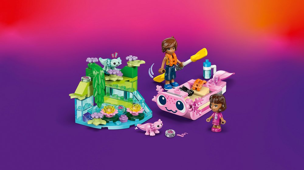 Děti si užijí velkou porci zábavy se člunem, který zdobí usmívající se přátelský obličej axolotla a kmitající ocas. Součástí jsou také sedátka pro postavičky, vesla a 2 záchranné vesty. Připojitelný menší model je zdoben rostlinami, květinami a kostkami v podobě vody, aby děti mohly vytvořit přirozené prostředí pro axolotly.