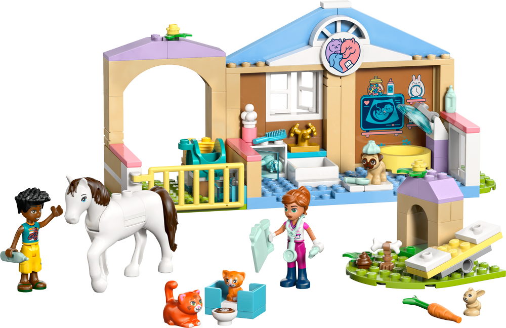- PÉČE O DOMÁCÍ MAZLÍČKY – Stavebnice LEGO® Friends Veterinární klinika se zvířátky(42696) obsahuje vše, co děti potřebují k hraní na péči o zvířata, včetně modelu koňské stáje, vyšetřovny, hřiště pro domácí mazlíčky a spousty dalšího