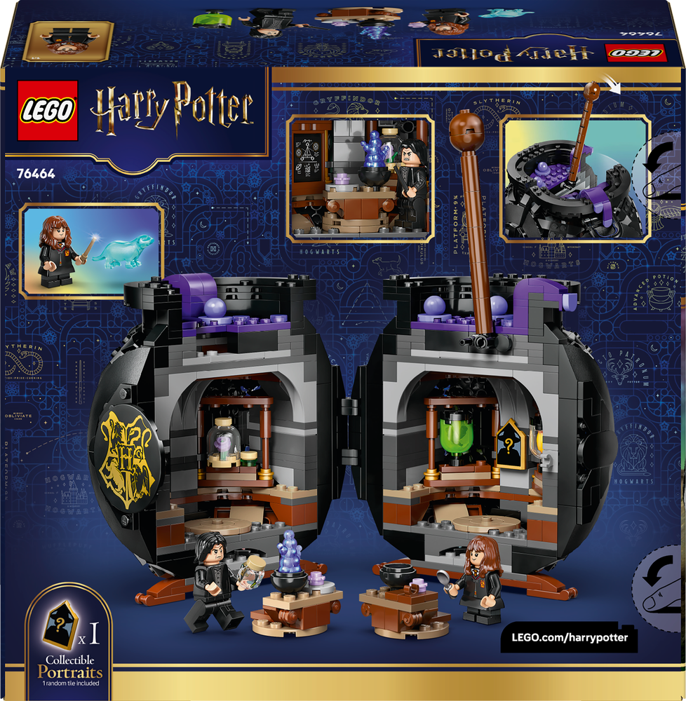 Darujte dětem kouzelnou stavebnici LEGO® Harry Potter™ (76464) na hraní i vystavení – kouzelný kotlík s tajnou učebnou lektvarů uvnitř. Posunutím míchátka odhalíte propracovanou učebnu s odnímatelnými lavicemi, lahvičkami s lektvary a přísadami z kostek LEGO. Zahrajte si na vlastní hodinu lektvarů v Bradavicích s minifigurkami profesora Snapea a Hermiony Grangerové. Najděte Hermionina patrona v podobě vydry, který je součástí kolekce patronů k 25. výročí řady LEGO Harry Potter (stavebnice se prodávají samostatně), a 1 ze 14 sběratelských bradavických portrétů
