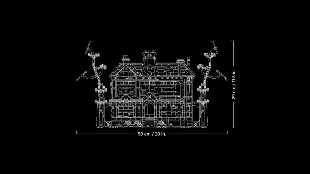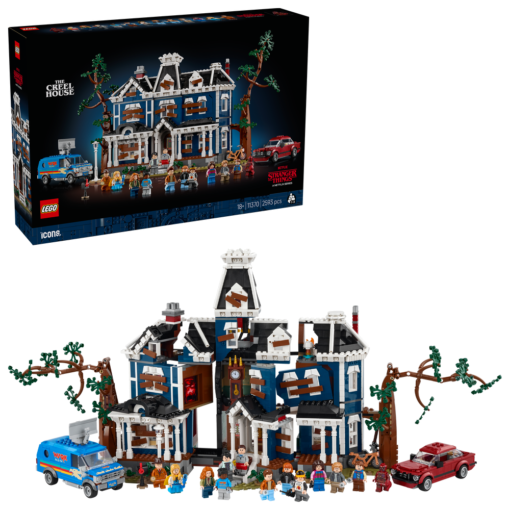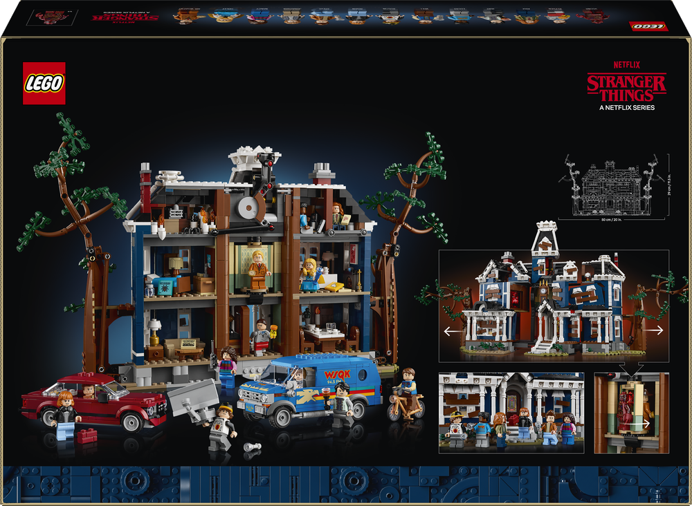 - ROZMĚRY – Stavebnice LEGO® Icons Stranger Things: Dům Creelových se skládá z 2 593 dílků a měří přes 29 cm na výšku, 50 cm na šířku a 17 cm do hloubky