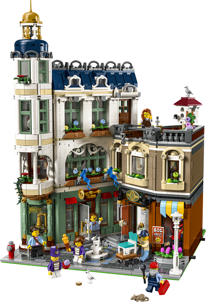 Třípodlažní budova zahrnuje dvoupatrový obchod s hudebními nástroji pro pochodové kapely a přilehlý krámek s nábytkem vybavený pultem, židlemi, stolem a dílnou. V nejvyšším patře se nachází zařízený byt s koupelnou a střešní zahrada s prostorem pro květináče a holubník. Tento model se stane skvělou dekorací do vaší domácí kanceláře, obsahuje 7 minifigurek a má modulární konstrukci se snadným přístupem dovnitř.