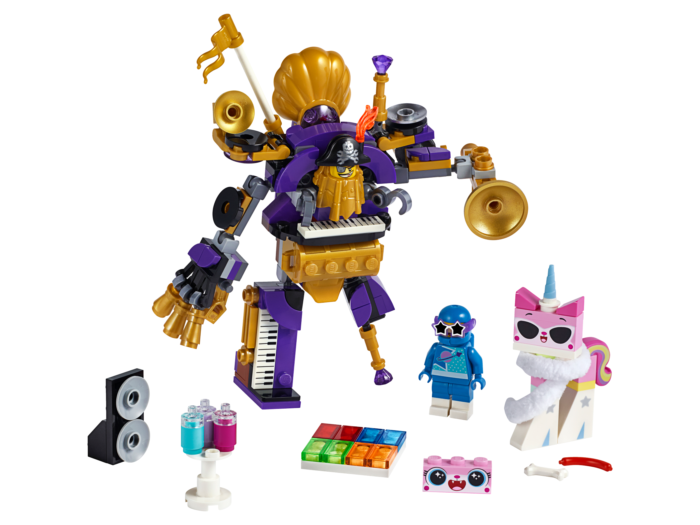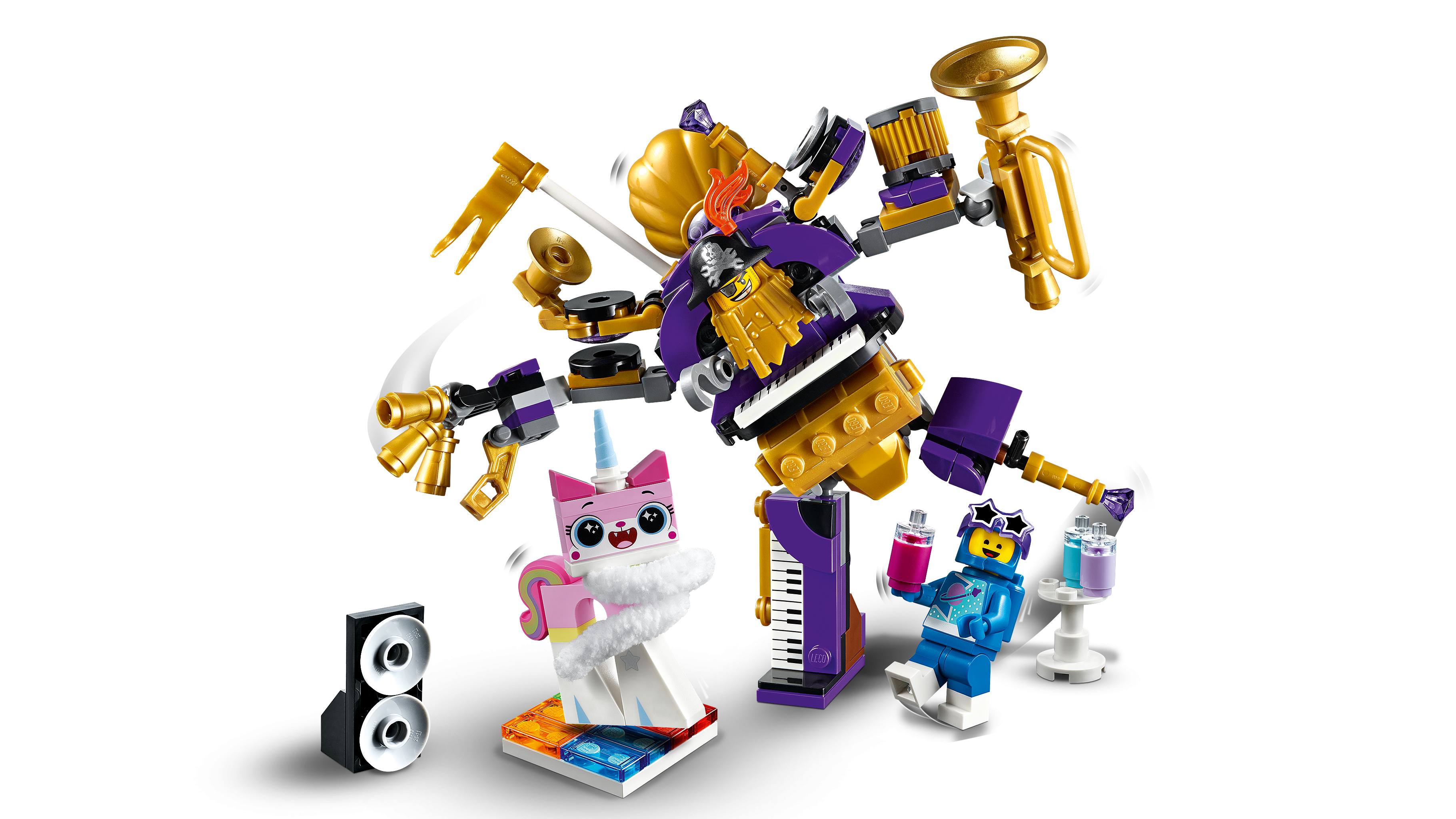 Pořádně to roztoč s párty partou ze Sestrálního systému! Nasaď LEGO® Unikitty péřové boa, ať je z ní Disco Kitty, a Bennymu hvězdné brýle, aby byl ozdobou každé tancovačky. Postav si Kovovousovu úžasnou jednočlennou metalovou kapelu v podobě velkého robota ze spousty vestavěných LEGO hudebních nástrojů. Dej si smoothie s hrdiny z filmu LEGO PŘÍBĚH 2 a pak to rozjeď na tanečním parketu!