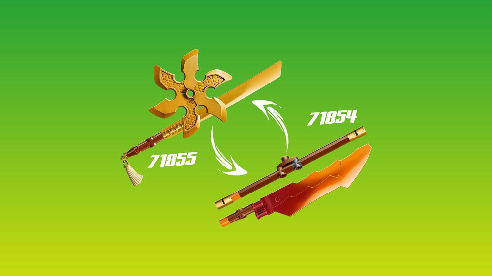 - 3 ZBRANĚ PRO ROBOTA – Robot je vybaven 3 zbraněmi: mečem, holí a pružinovým blasterem se 2 šipkami, které lze vyměnit za zbraně ze stavebnice Bitva nindžovského draka Riyu (71855) (prodává se samostatně)