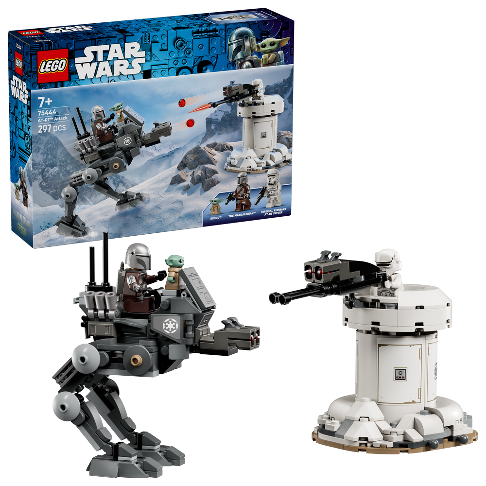 Nechte děti vydat se na vlastní dobrodružství z filmu Star Wars: Mandalorian a Grogu s modelem Útok AT-RT (75444). Obsahuje pohyblivého chodce AT-RT s dvojitým vystřelovačem a obrannou věž s otočnou věžičkou a vlastním dvojitým vystřelovačem. Umístěte minifigurku řidiče AT-RT Imperiálního zůstatku nebo minifigurku LEGO® Mandaloriana na sedadlo AT-RT (odstraňte prvek palubní desky a udělejte místo pro figurku LEGO Groga, která pojede s Mandem). Otevřete obrannou věž a odhalte stojan na zbraně a úložný prostor. Pro extra porci fantasy bojové akce vybavte Mandaloriana jetpackem a blasterovou pistolí a řidiče AT-RT blasterem.