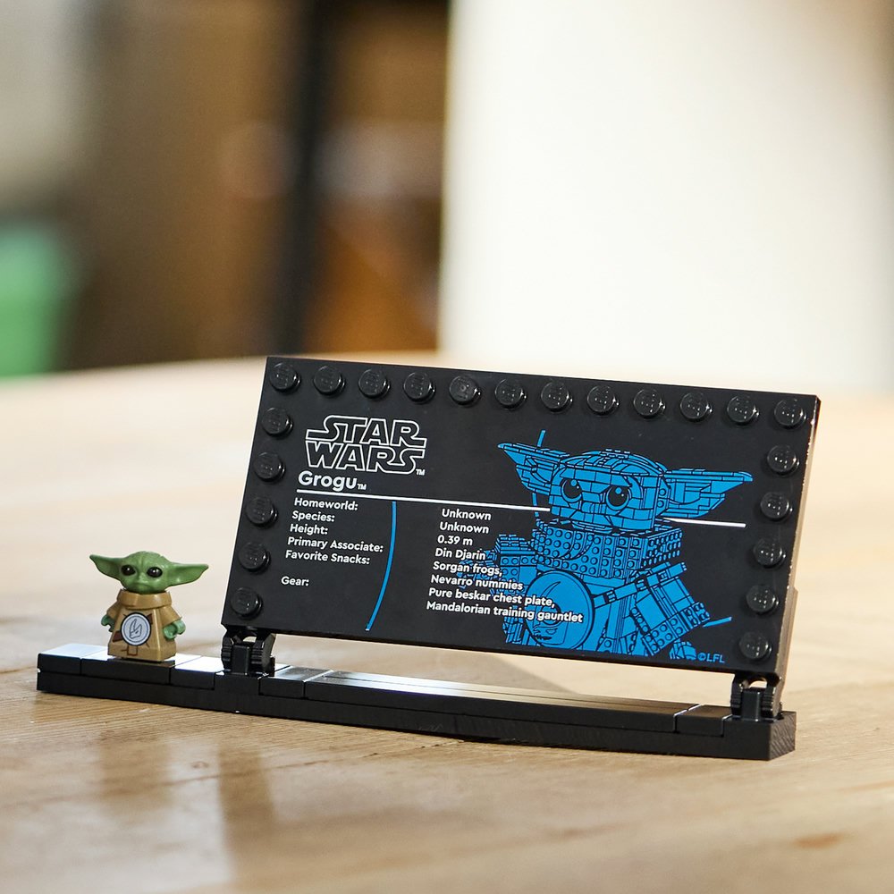 Hotový model z kostek vystavte s cedulkou s informacemi o Groguovi a doplňte figurkou LEGO Grogua ve standardní velikosti, abyste vytvořili roztomilou dekoraci Star Wars, která potěší každého fanouška.