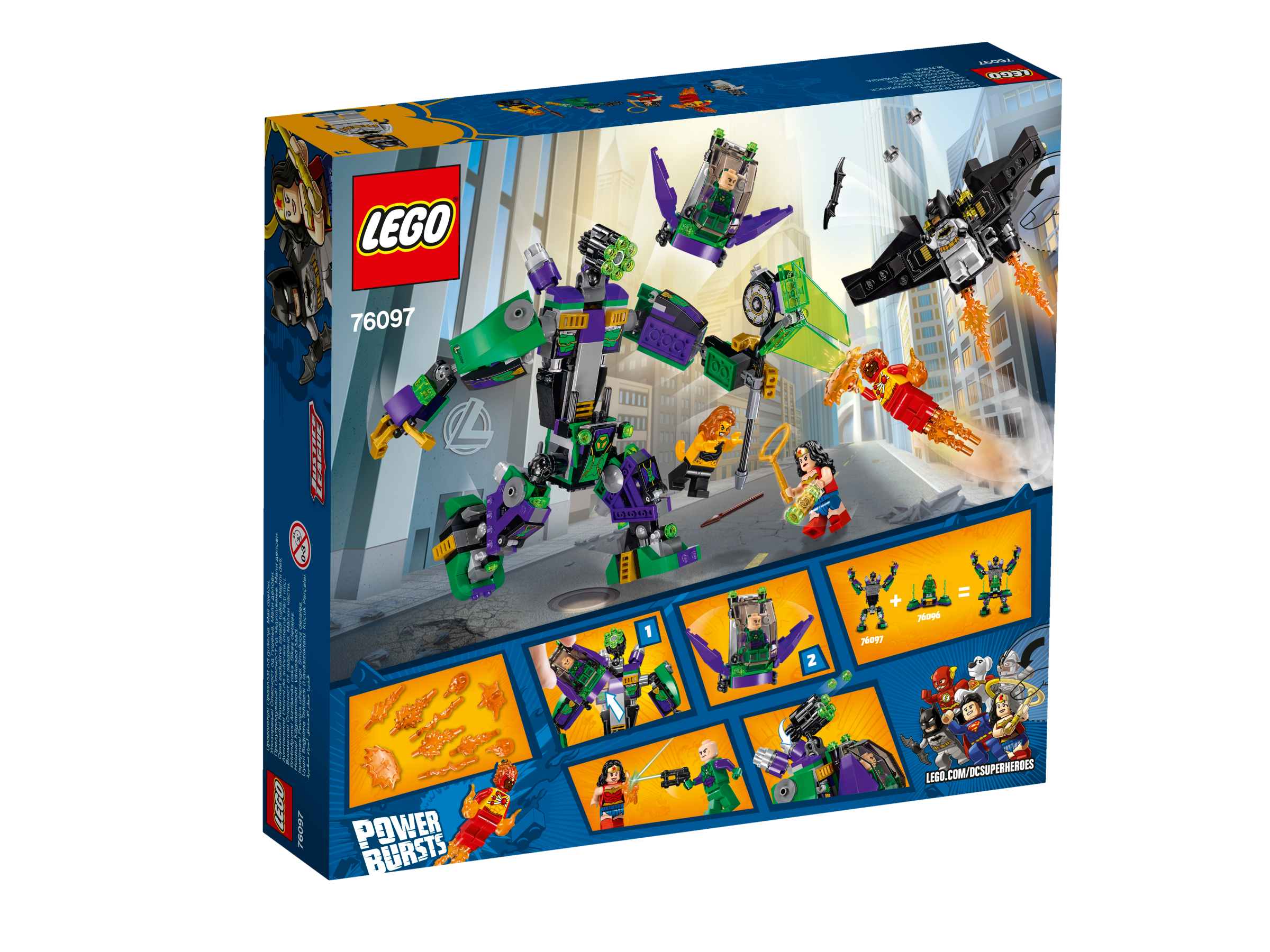 - Robot Lexe Luthora má otevírací kokpit pro minifigurku/únikový modul, pohyblivé nohy, ruce a prsty, nastavitelný šestiranný vystřelovač, sestavitelnou sekeru, místo pro 3 sběratelské energetické schránky, a navíc taky místo pro připojení kryptonitového vězení ze sady 76096 Superman™ a Krypto™ se spojili.