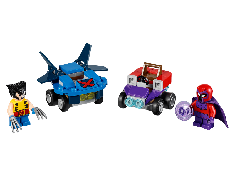 - Součástí jsou minifigurky s mini nohama Wolverina a Magneta.
