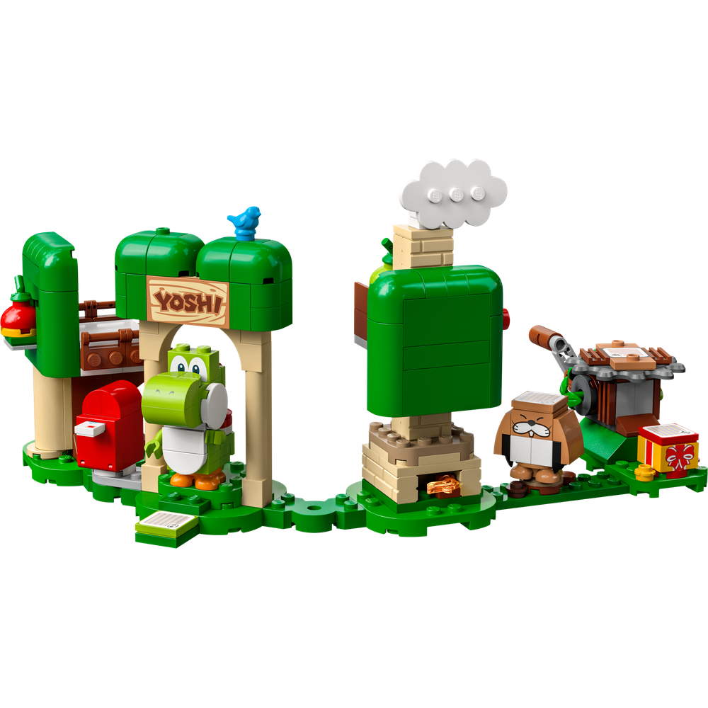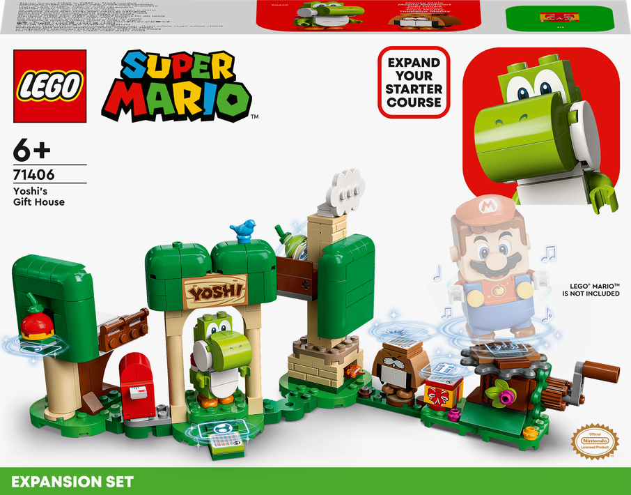 S rozšiřujícím setem LEGO® Super Mario™ Yoshiho dům dárků (71406) se děti mohou těšit na další zábavnou úroveň ve společnosti Yoshiho a Montyho Molea. Hráči mohou prozkoumávat okolí a sbírat digitální mince s interaktivními figurkami LEGO® Maria, LEGO® Luigiho nebo LEGO® Peach™ (nejsou součástí setu). Pozdravte Yoshiho u dveří, zdřímněte si v posteli, sbírejte ovoce, roztočte kolotoč odměn, díky čemuž ovoce zezlátne, a obdarujte některou z dalších interaktivních figurek. Nebo si na ovoci pochutnejte se samotným Yoshim. (Poznámka: Pro plnohodnotný interaktivní herní zážitek je vyžadován startovací set 71360, 71387 nebo 71403.)