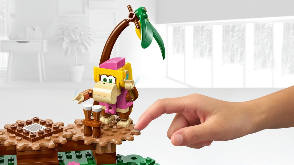 - 2 postavy LEGO® Super Mario™ z džungle, kde žije Donkey Kong – Dixie Kong s prvkem kytary a papoušek Sqawks se sestavitelným mikrofonem, a navíc sestavitelná bonga a zesilovač