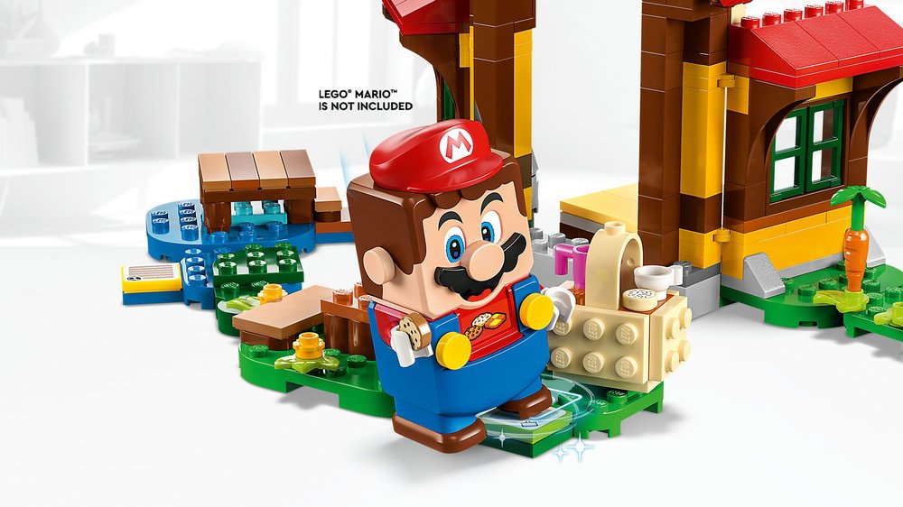 - Zábavné funkce – LEGO® Mario™ může spát v posteli, „pochutnat“ si na něčem z piknikového koše, „zalít“ zeleninu na zahradě, hrát hokej s využitím piknikového stolku jako brány a mnoho dalšího
